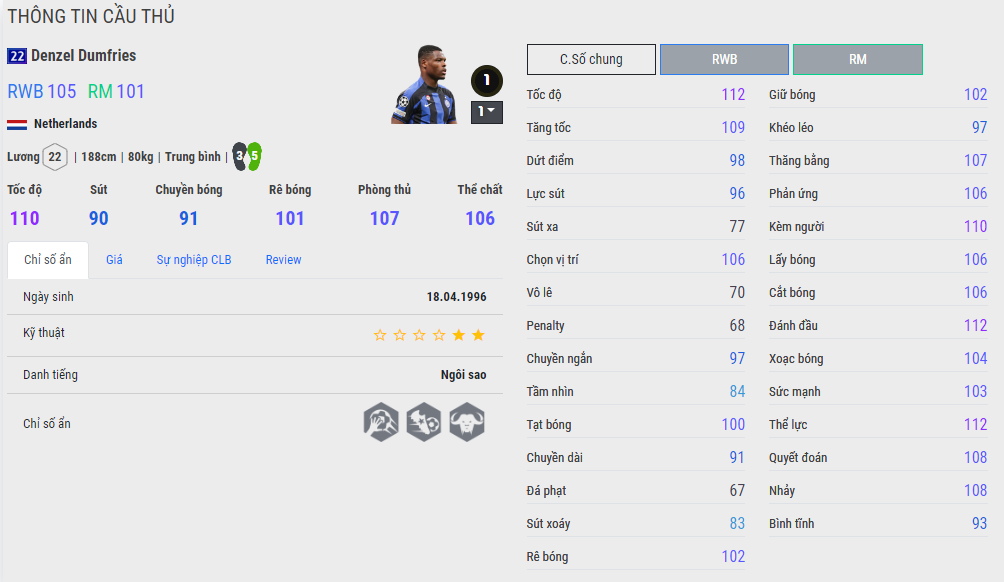 Năm nay có thể coi là một năm thi đấu thành công của hậu vệ cánh người Hà Lan, mặc dù anh không được nổi tiếng lắm và tương đối thầm lặng. Nhưng tháng 4 này anh lại chính là cầu thủ có tỷ lệ cắt bóng thành công cao nhất lên tới 1,4 lần/trận. Dumfires 22UCL vừa được tăng chỉ số và đó là tin vui với những người đang sở hữu anh. Ngoài thể hình cao lớn thì tốc độ của Dumfries chính là thứ vũ khí lợi hại nhất giúp trung vệ Inter Milan có thể vô hiệu hóa rất nhiều tiền đạo chạy nhanh trong game.
