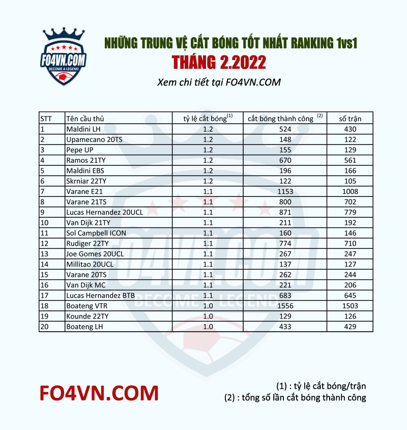 Một thống kê quan trọng nữa dành cho các bạn quan tâm chính là những trung vệ tốt nhất trong tháng 2 ở hạng mục : cắt bóng