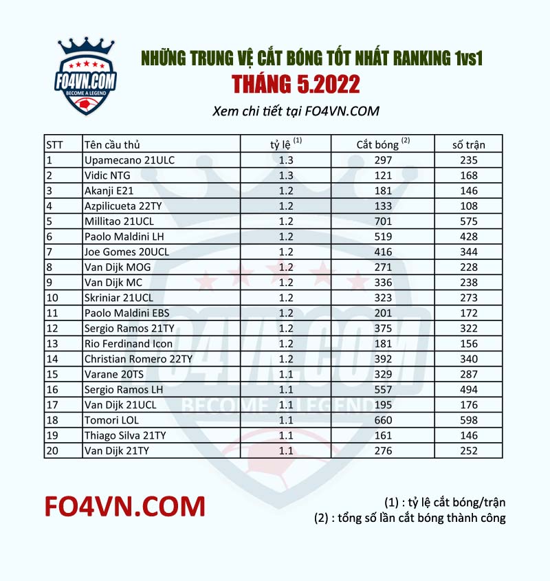 - Những cái tên như Rudiger 21UCL, 22TY hay Varane 21TS cũng có chỉ số cắt bóng tầm 1,1 tuy nhiên do fo4vn thống kê lấy từ trên xuống, nên 3 cầu thủ này không có trong sanh sách.