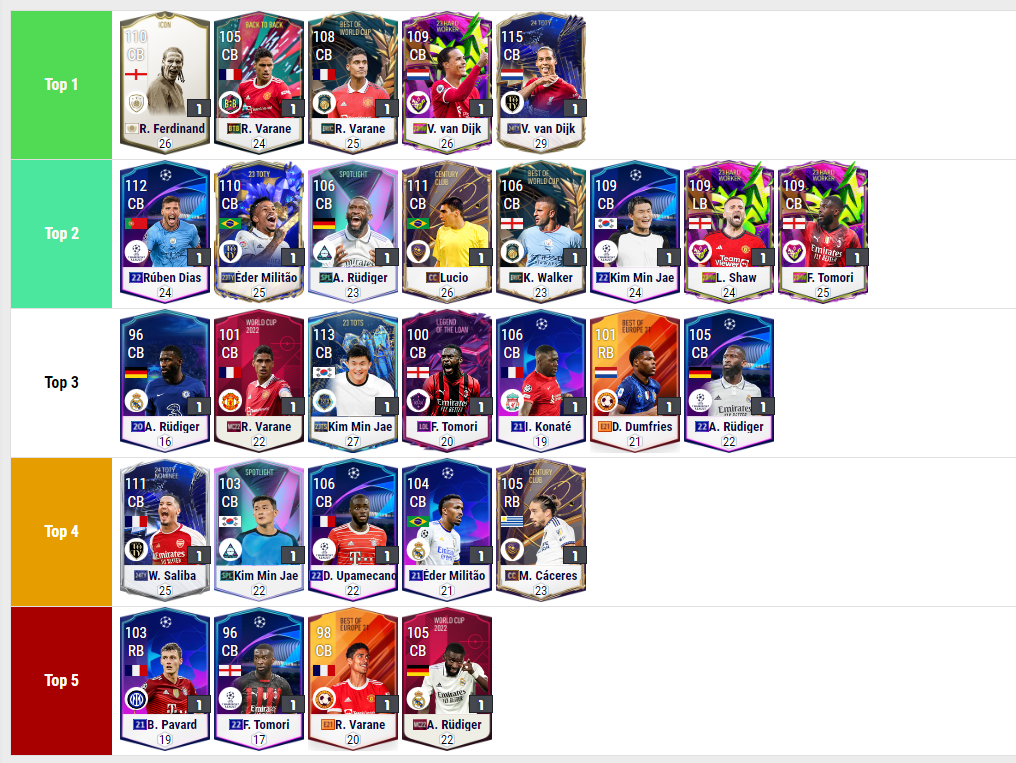 Có tới hai cái tên hiện thuộc team color Manchester United có mặt trong top 1 là Ferdinand và Varane. Sau một thời gian lặn sâu thì giờ đây Varane BTB đã trở lại và lợi hại hơn xưa. Câu chuyện về việc chọn ai cho vị trí hàng phòng ngự của các fan hâm mộ Mu giờ đây trở lên dễ dàng hơn rất nhiều. Rio Ferdinand qua hai tháng gần nhất đều thể hiện được một khả năng cắt bóng tuyệt vời, điều mà rất ít trung vệ duy trì được trong thời kỳ lạm phát chỉ số hiện nay, hơn nữa thẻ mùa giải của Ferdinand chỉ là mùa ICON, có giá khá rẻ và cũng dễ sở hữu.