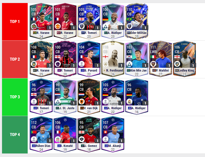 Đầu tiên chúng ta sẽ kể đến sự thay đổi khá nhiều ở vị trí của Rudiger, việc chỉ còn 3 mùa giải là SPL, 22UCL và 20UCL đặt dấu hỏi khá lớn về việc WC22 đâu rồi ? lý do khả dĩ nhất có lẽ là do mùa này đã vào giới hạn và số lượng người sử dụng không nhiều, việc có được Rudiger WC22 +8 là tương đối khó trong khi đó nguồn thẻ như SPL rõ ràng dồi dào hơn.