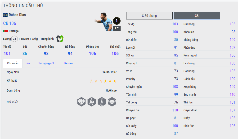 Trung vệ số 1 của đội tuyển Bồ Đào Nha hiện tại là một cái tên cực mạnh của mùa giải 22TS với AI được nâng tầm lên rất nhiều. Mạnh mẽ với khả năng cắt bóng, bọc lót cho đồng đội. Ruben Dias chính là cái tên mà bạn hoàn toàn có thể tin tưởng cho chốt chặn cuối cùng của hàng phòng ngự