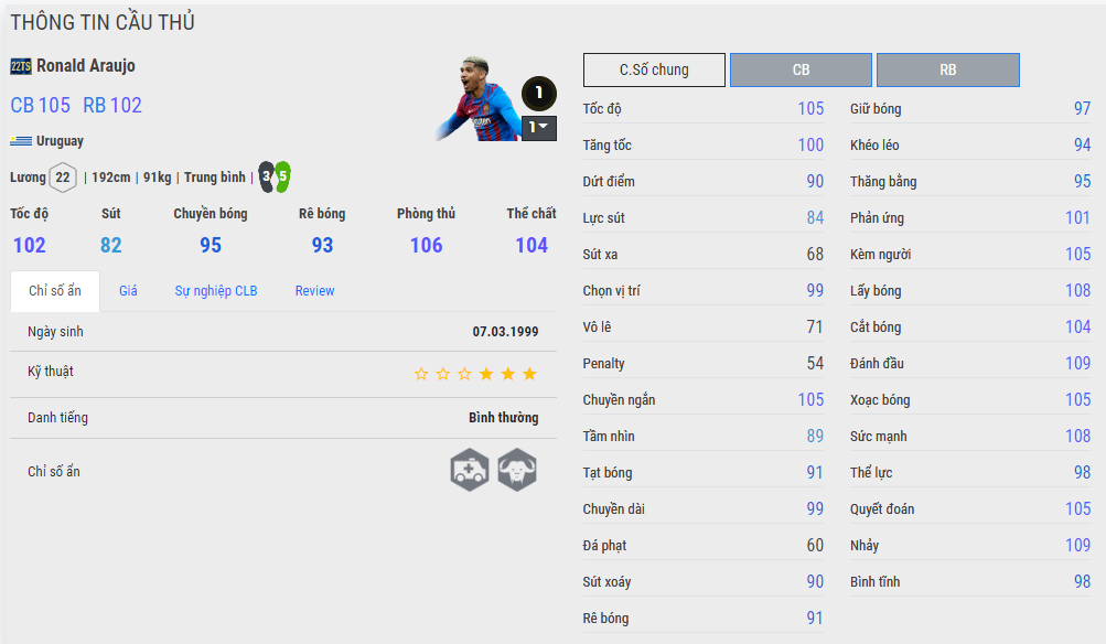 Trung vệ của Barca và đội tuyển Uruguay nổi bật với chiều cao tốt và khả năng tackle bóng rất mạnh mẽ, đây là mùa đầu tiên mà Araujo bứt phá hẳn nên để trở thành một cái tên đáng dùng dành cho các HLV của Fo4. Fan của Barca cuối cùng cũng có được một trung vệ đúng nghĩa với meta của Fo4.