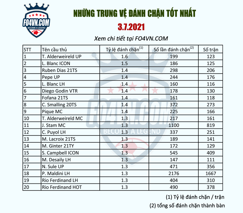 Dưới đây là thống kê các trung vệ đánh chặn tốt nhất hiện tại, tính đến thời điểm viết bài, trong ranking 5000