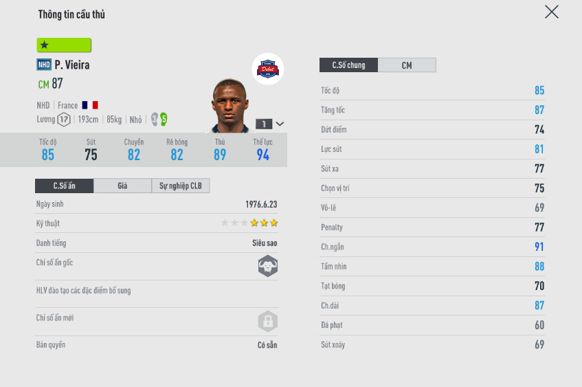 Vị trí số 1 lại thuộc về một cầu thủ chơi ở vị trí tiền vệ phòng ngự. Tuy nhiên qua 3 năm trò chơi phát hành thì Vieira NHD vẫn chứng tỏ được giá trị sử dụng của mình, chất đến từng đồng, chơi bóng chắc chắn và đặc biệt mùa giải NHD đá CB cực chất lượng.