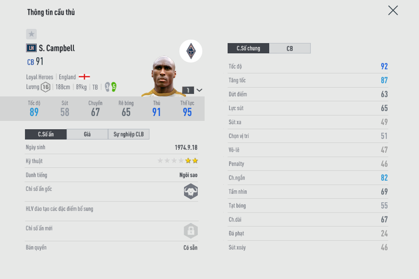 Huyền thoại của Ars và cũng là trung vệ duy nhất của CLB này có mùa giải ICON. Nhưng khác với FO3, Cambpell không còn bá đạo như trước, vẫn tốc độ cao, đấm nhau tốt, nhưng thể hình to dày làm anh dễ bị vặn sườn, thậm chí gặp khó khăn khi bị đối phương múa skill qua người.