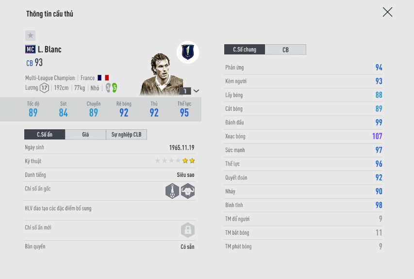 Là trung vệ có đầy đủ mọi thứ từ chiều cao, tốc độ và một AI cần thiết cho mọi meta game. Đây chắc chắn là trung vệ số 1 mà bạn nên có trong đội hình nếu sử dụng team Barca. Tuy vậy có đôi chút khó khăn cho người chơi trong việc lựa chọn mùa giải của huyền thoại người Pháp.