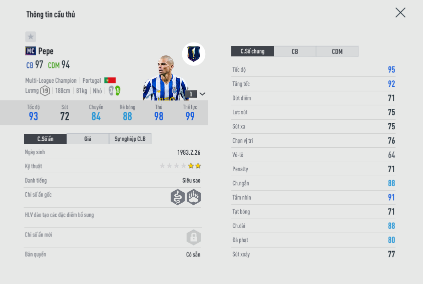 Không rõ các bạn có coi Pepe là huyền thoại hay không ? do trong quá khứ anh có những tình huống không được đẹp mắt cho lắm. Nhưng việc nhiều năm chơi bóng trong màu áo Real và cùng Bồ Đào Nha vô địch Euro 2016. Tài năng của anh là điều khó có thể phủ nhận. Lối chơi rắn, rát và đặc biệt tackle bóng cực chuẩn là điều mà bạn có thể tận dụng khi sử dụng anh. Anh có 3 mùa giải với chỉ số tốt trong game là LH, VTR và MC. Fo4vn xin được đề xuất mùa giải MC với khả năng không chiến cực tốt của anh