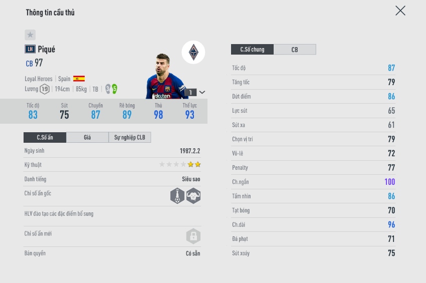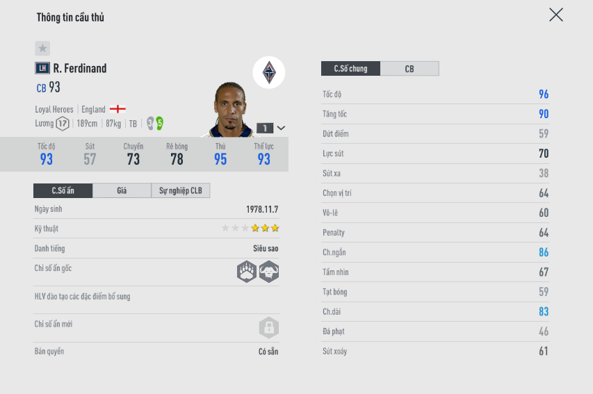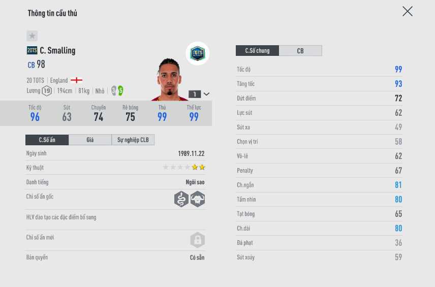 Tất nhiên đây là cái tên không thể thiếu nếu bạn hâm mộ MU. Và cũng là trung vệ số 1 hiện nay khi bạn xây dựng team quỷ đỏ, chiều cao tốt, sải chân dài, cùng với AI phòng ngự thông minh. Đây xứng đáng là một chốt chặn an toàn cho đội hình của mình. Mùa giải được lựa chọn là LH. Và tỷ lệ không chiến cực cao, và đặc biệt thường xuyên có những pha cứu thua không tưởng.