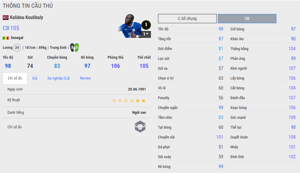 trung vệ này đóng vai trò lớn trong thành công của Napoli cũng như đội tuyển Senegal trong năm qua. Việc được Chelsea chiêu mộ đã nói lên đẳng cấp của trung vệ đã bước qua tuổi 31 này, có sức vóc có khôn ngoan, Koulibaly là một cái tên rất mạnh trong việc tranh chấp và cắt bóng. Một sự bổ sung rất tốt cho những ai đang chơi team Chelsea khi cần một người đá cặp với Rudiger.