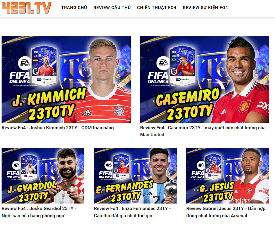 Một website mới, hiện nay đang đi theo hướng chuyên biệt là review cầu thủ trong game với số lượng Review Fo4 ra khá đều và nhanh. Bài viết cũng có sự đầu tư và chấm điểm kỹ càng, số lượng cây bút cũng đa dạng với những góc nhìn khách quan hơn. Tất nhiên nó cũng không thể tránh được những đánh giá mang tính chủ quan được. Nhưng dù sao cũng là một nơi để các bạn có thể tham khảo review khá hay.