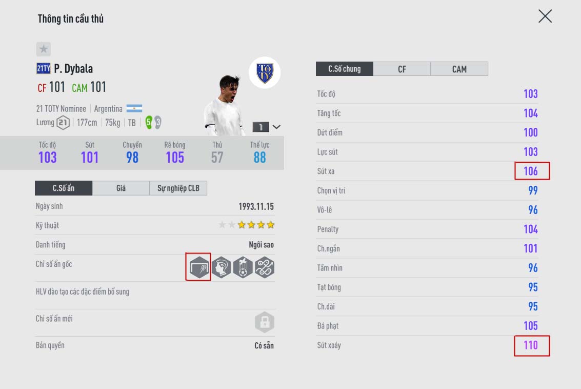 Paulo Dybala 21TY-N là cầu thủ tương đối khó dùng do các chỉ số về thể chất có phần yếu thế trong game. Cách đây vài ngày Fo4vn đã có bài review về cầu thủ có kiểu ăn mừng đặc biệt này các bạn có thể tìm trong mục Review của website.