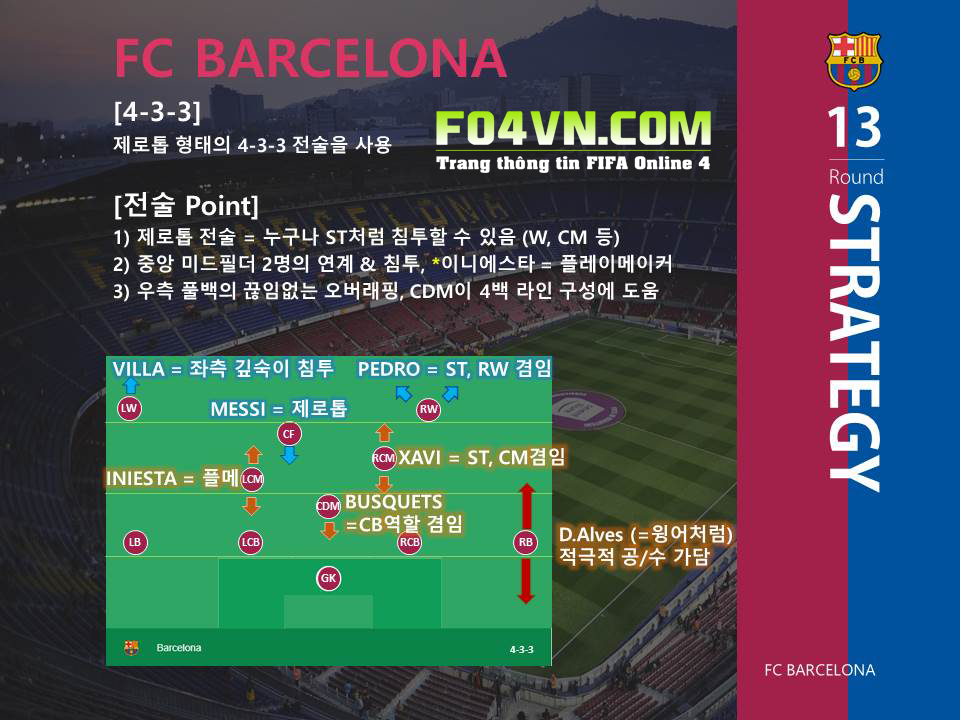 Tuy nhiên, để vận hành sơ đồ 4-3-3 này trong FIFA Online 4 theo đúng cách chơi của Barca, chúng ta cần có 1 chút thay đổi trong việc sắp xếp đội hình. Cụ thể như hình bên dưới,4 vị trí hậu vệ để cân bằng, tuy nhiên hậu vệ cánh phải sẽ có xu hướng tham gia tấn công nhiều hơn. Ở hàng tiền vệ, CDM giữ nguyên, tuy nhiên với 2 CM, RCM được đẩy lên chơi cao hơn 1 chút so với LCM.Vị trí CF hơi kéo xuống 1 chút , RW đẩy dâng cao còn LW thì bám cánh nhiều hơn.