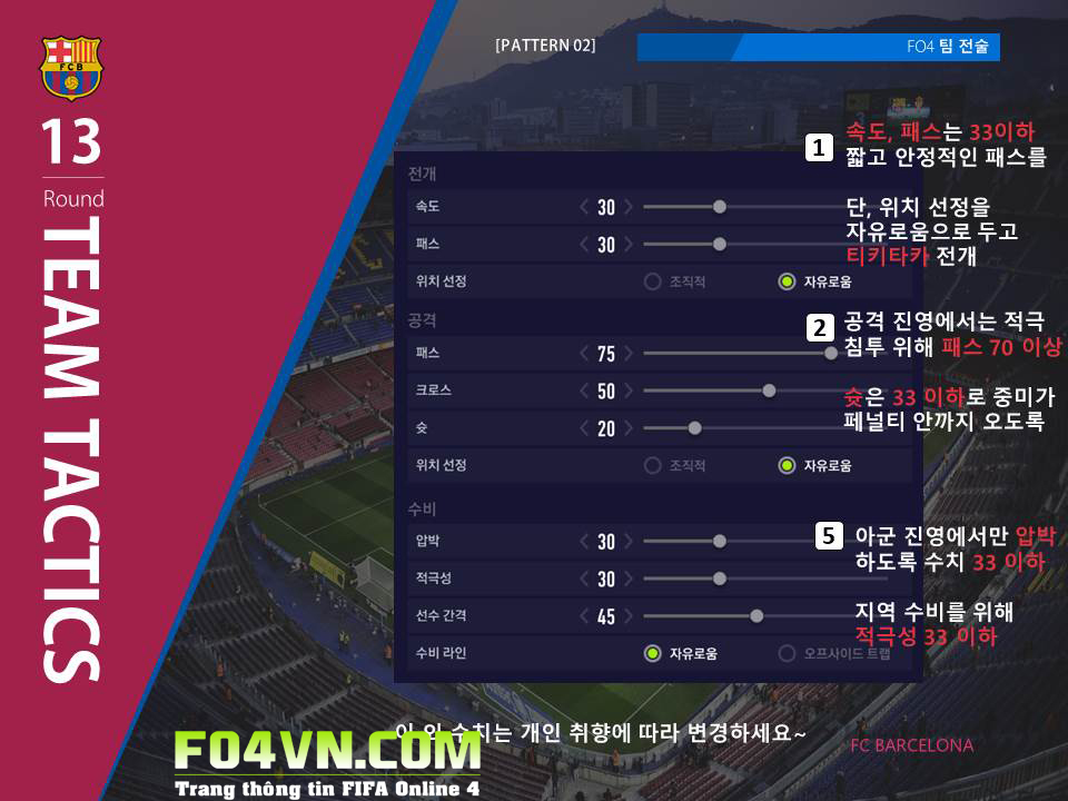 Tổng quát : Tốc độ 30 và chuyền 30 để kéo hẹp cự li của các cầu thủ cùng tốc độ 30 để các cầu thủ vào bóng mỗi khi có cơ hội thực sự rõ ràng. Lối chơi sẽ trở nên chậm rãi và từ tốn hơn. Thiết lập di chuyển tự do để các vị trí linh hoạt trong khâu di chuyển phân tán lực lượng để kiểm soát thế trận.