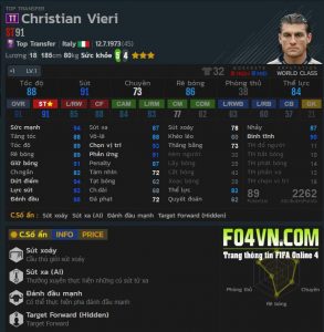 - Tốc độ : Tăng tốc 88 và tốc độ 89, ingame chạy nhanh hơn hẳn mùa NHD, Vieri chạy rất đúng với chỉ số, khá tốt cho một tiền đạo khi nó không quá nhanh nhưng bù lại độ càn lướt của huyền thoại Inter thì khỏi phải bàn nên bạn có thể yên tâm.
