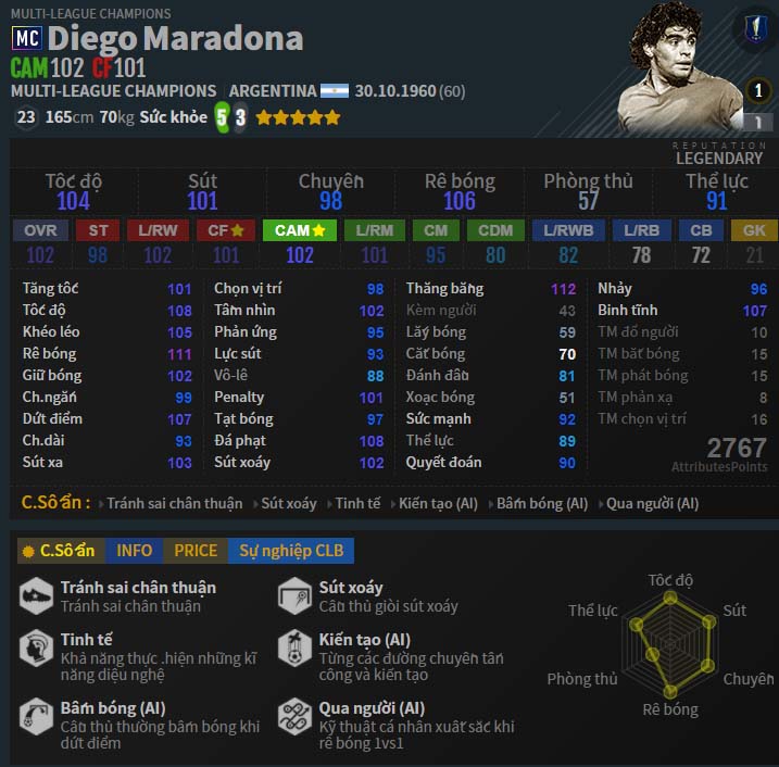 - Maradona có chỉ số ẩn tránh xài chân không thuận. Nhưng bạn yên tâm, chân phải của anh ấy dứt điểm vẫn khá tốt, việc có chỉ số ẩn này, sẽ giúp Maradona luôn cố gắng sử dụng chân trái để chuyền hay dứt điểm