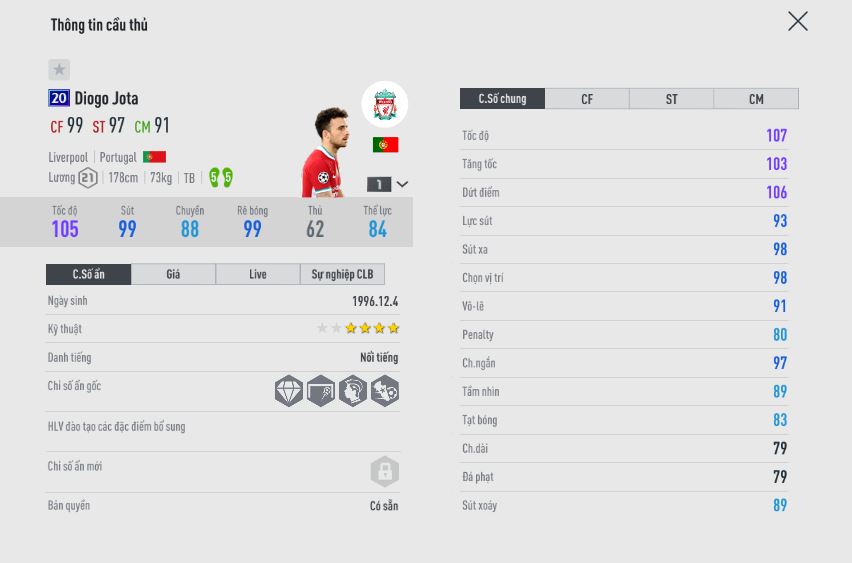 Bạn đang sở hữu một cầu thủ với hai chân 5/5 và tốc độ ra chân cực tốt. Gần như kỹ năng một chạm hoàn hảo. Đặc biệt là các tình huống ở tư thế khó, Jota sẽ thể hiện cho bạn thấy anh ấy đáng đồng tiền bát gạo như thế nào