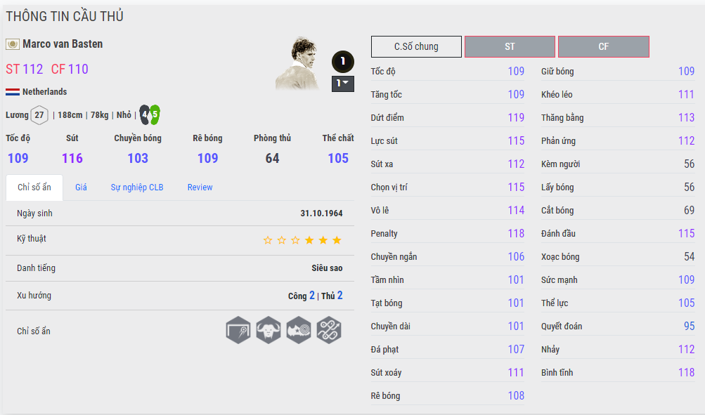 - Tốc độ : Dù có tốc 109 và tăng tốc cũng vậy, nhưng thật sự vào sân thì chỉ số này không được ổn lắm, nói cách khác nhìn Basten chạy như đèo chì vào chân và thường khi có bóng còn ỳ ạch hơn nữa. Không rõ có phải Nexon có sai trong cách tạo cầu thủ không, nhưng quả thực ngoài đời Van Basten khá thanh thoát, ít nhất qua các clip youtube thì ông đều sở hữu các động tác cực mượt mà.