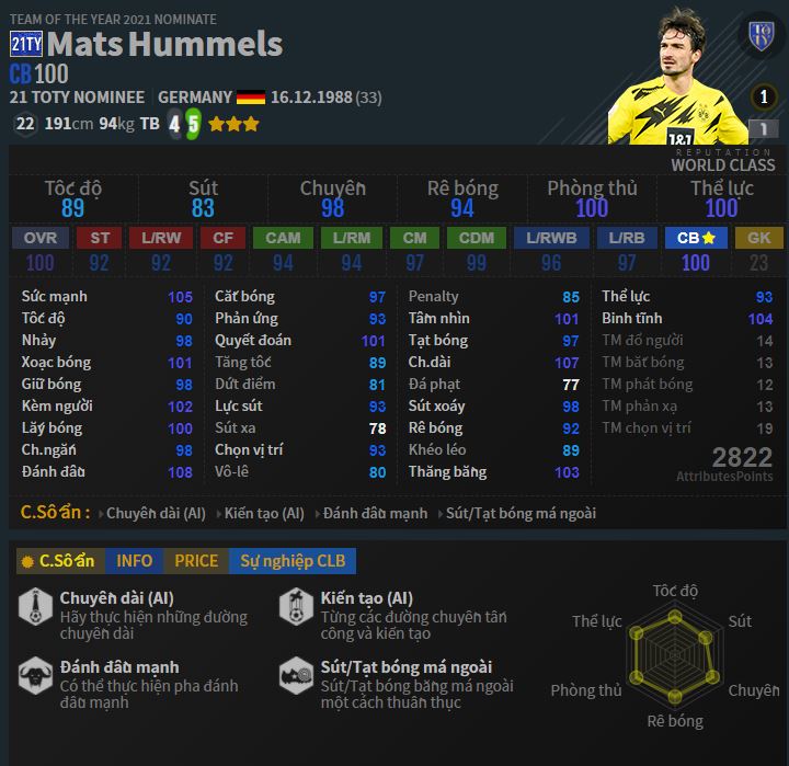 Trung vệ cao lớn Mats Hummels là số ít những CB chất lượng trong vòng 1 thập kỷ qua của bóng đá thế giới. Khi anh có đầy đủ mọi phẩm chất của một ông chủ nơi hàng phòng ngự. Nhãn quan chiến thuật, khả năng đọc tình huống cùng vô số những pha cản phá không tưởng. Cho dù đã qua đỉnh cao phong độ nhưng Hummels vẫn có mặt trong danh sách đề cử 21TY