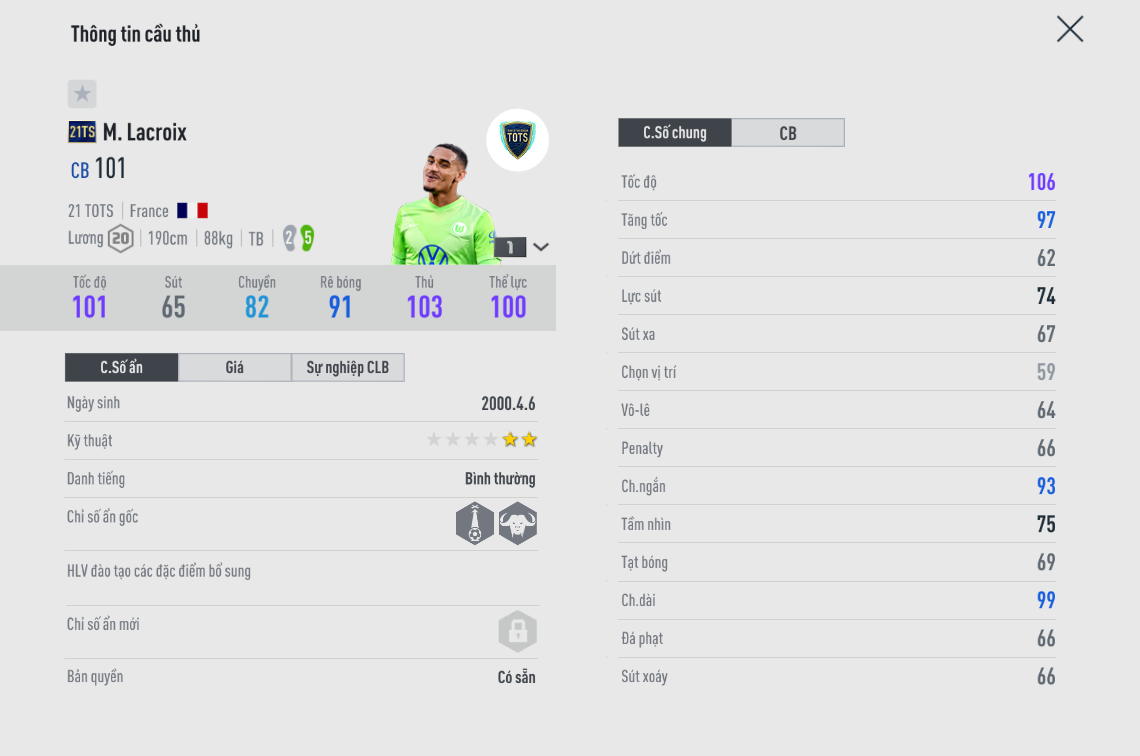 Nếu nói tốc độ của Lacroix tốt thì có lẽ đúng với một cầu thủ có sức vóc như anh, nhưng nếu nói đã đủ nhanh để theo mấy máy chạy trong game thì chưa. Tất nhiên theo đánh giá chủ quan của Fo4vn thì đây được coi là điểm mạnh của anh chàng to con này. Vì dù gì với một khả năng tăng tốc như vậy đã là đủ dùng rồi.