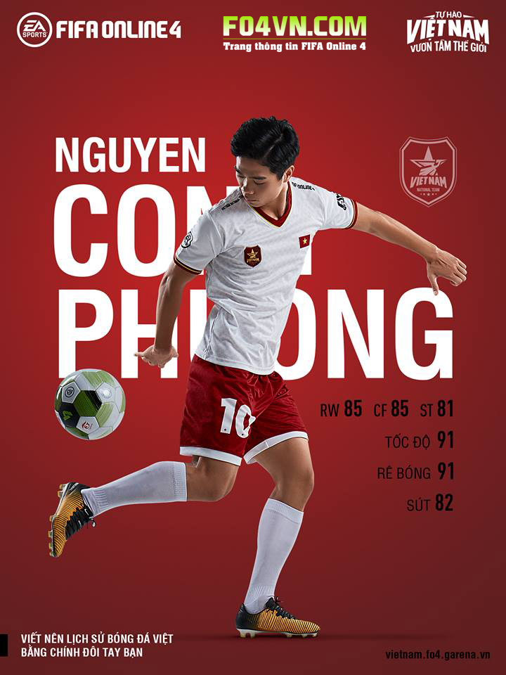 Công Phượng là 1 trong 3 cầu thủ Việt Nam đầu tiên được xuất hiện trong Fifa Online 4. Được mệnh danh là Messi của Việt Nam. Trước khi ra mắt anh được người hâm mộ Fifa Online 4 mong chờ nhất, ngay cả khi xuất hiện thì anh là cầu thủ được săn đón nhiều nhất trong các cầu thủ Việt Nam được ra mắt. Vậy trong game MessiVN thể hiên ra sao, chúng ta cùng hãy cùng xem.