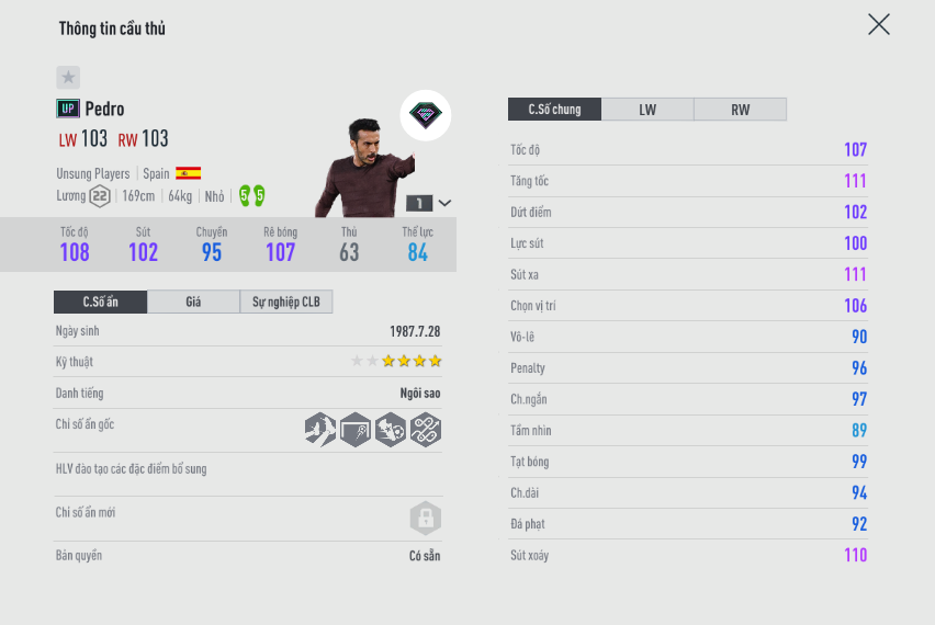 Cựu cầu thủ của Barca, là một trong số ít những hàng độc lạ trong game, cho dù thể hình của Pedro cũng chẳng to cao gì, nhưng với độ hiệu quả của anh trong game có lẽ còn hơn cả Messi. Mới đây thì mùa giải UP được ra mắt, với chỉ số vượt trội, hơn cả mùa MC. Hãy cùng đến với bài review Pedro UP của kênh KAD Chanel