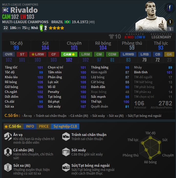 * Tốc độ : chậm hơn chỉ số, dù sải chân dài nhưng Rivaldo chạy chậm nhất là khi cầm bóng, bạn chỉ có thể tăng tốc cho anh bằng cách đẩy bóng dài để hạn chế phần nào. Nhưng giờ các CB đều quá nhanh so với một CAM hay LW như anh