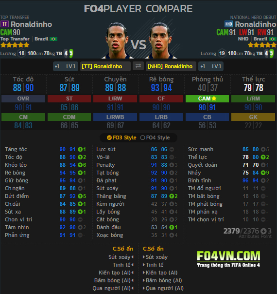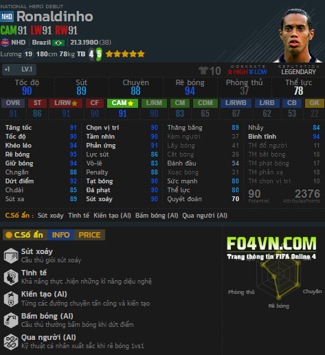 - Rê bóng : với 5 sao kỹ thuật cùng chỉ số ẩn qua người, Ronaldinho lách bóng rất nhanh khi đối đầu 1 vs 1 với cầu thủ đội bạn. Cùng với đó, với những ai thích sử dụng kỹ thuật cá nhân để qua ngươi Ronaldinho đều thực hiện tốt và vô cùng khéo léo. Mình hay sử dụng những tình huống giật và đẩy bóng bằng phím Z để vượt qua trong những tình huống kèm đông hậu vệ và cảm thấy vô cùng hiệu quả. Để biết thêm chi tiết các bạn tham khảo bài viết : https://fo4vn.com/ky-thuat-giat-lui-bong-trong-fifa-online-4/ trên trang fo4vn.com.
