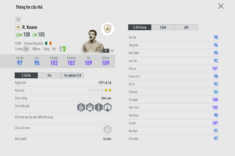 Từng là cầu thủ có lối chơi rắn nhất ngoại hạng Anh, đồng thời cũng là đội trưởng huyền thoại của Quỷ đỏ MU. Roy Keane luôn được coi là đối trọng của Vieira, thậm chí câu chuyện của cả hai đã vượt ra cả ngoài sân cỏ. Trong khi Vieira đã làm mưa làm gió trong game từ lâu, thì Roy Keane vẫn được mong chờ sẽ có mùa giải đủ tầm để có thể được người dùng chú ý hơn trong game. Và giờ mùa giải cao nhất của anh đã xuất hiện với ICON.