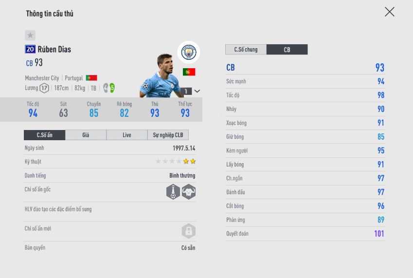 Hậu vệ chủ lực của Mancity ở mùa giải năm nay, đang có những ngày tháng cực đẹp tại sân Etihad. Với bộ chỉ số cực đẹp cho một trung vệ, có thể nói đây chính là một cái tên cực hot cho mùa giải 20UCL. Không chỉ bởi thể hiện trong game, mà còn bởi anh rất dễ được tăng chỉ số nếu MC vào sâu tại C1.