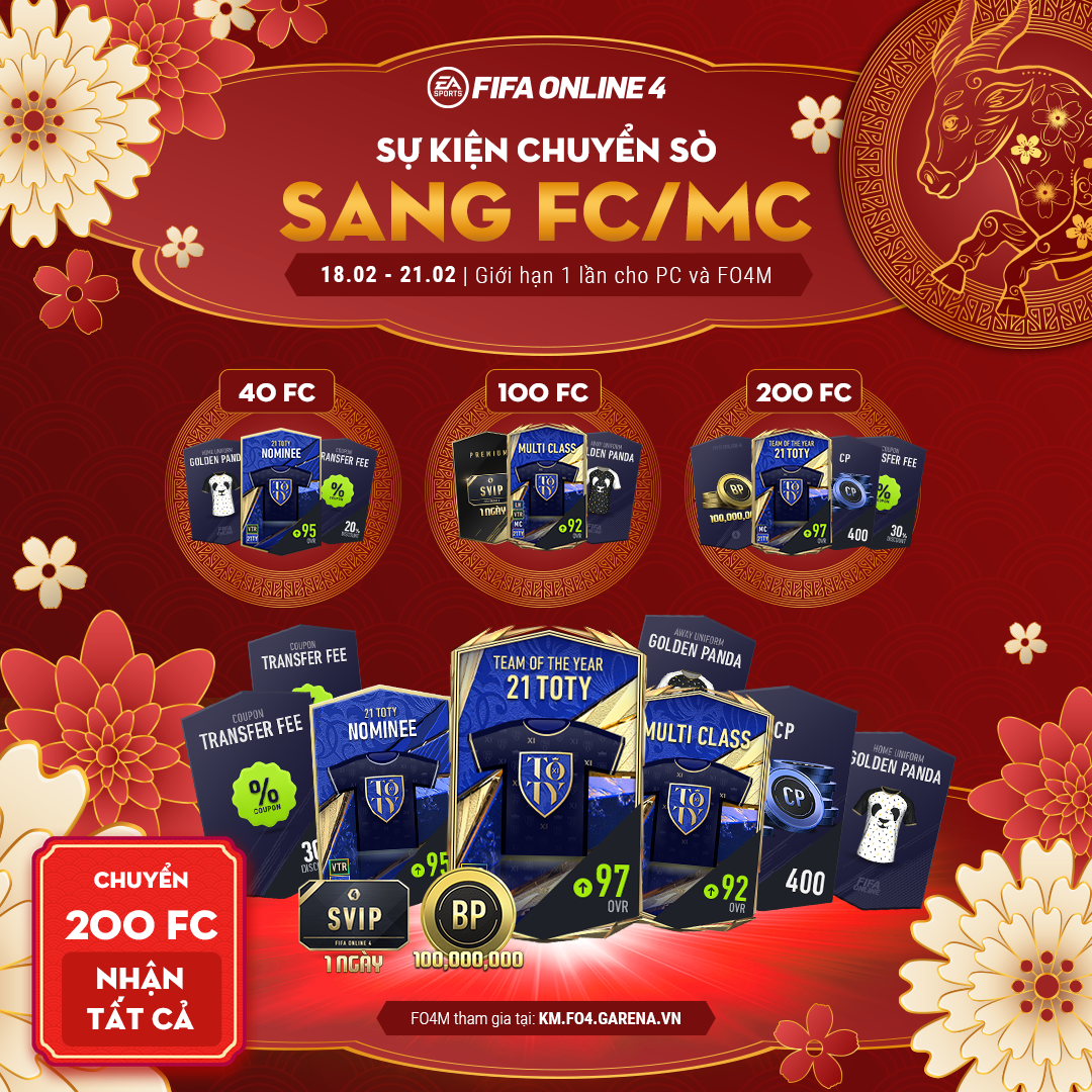 Khi chuyển Sò đạt mốc 200 FC/MC, các HLV sẽ nhận tất cả quà tặng của mốc 40 FC/MC và 100 FC/MC bao gồm cơ hội sở hữu 21TOTY/ 21TOTY Nominee và áo đấu Golden Panda