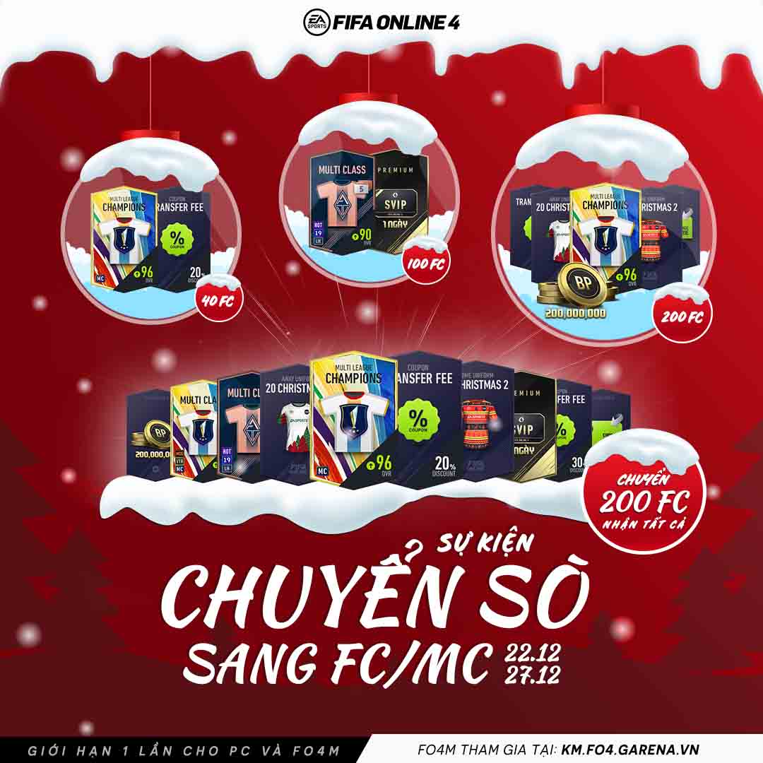 Từ ngày 22/12-27/12 Garena cho ra mắt sự kiện Chuyển sò sang FC/MC với phần quà vô cùng hấp dẫn là các gói cầu thủ MC/VTR/MG 96+, gói 90 + mùa LH/19ULC/HOT + 3~5, gói M96+ , thẻ đổi tên và đặc biệt là áo đấu giáng sinh phiên bản đặc biệt để đổi gió trong không khí Noel đang đến dần.