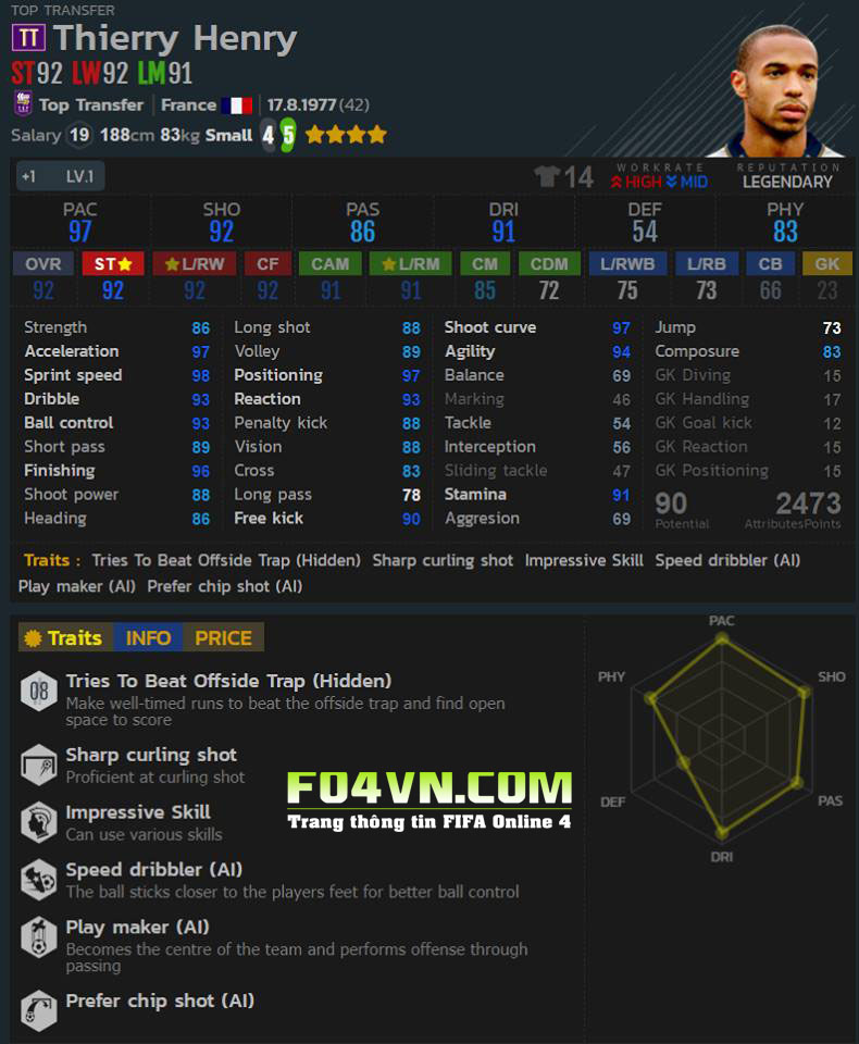 - Rê bóng : Với 4 sao skill, chỉ số rê bóng tổng quát 91, Henry rê bóng dẻo, đảo hướng bóng nhanh. Thêm vào đó là thể hình gầy khiến anh xoay sở nhanh hơn.