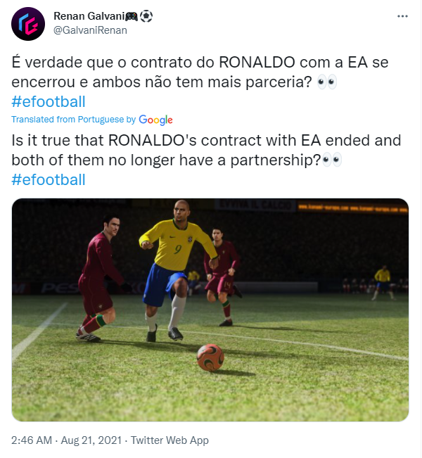 Mới đây thì một tài khoản trên mạng xã hội Twitter chuyên về tựa game PES ( efootball ) đã đăng tải một dòng trạng thái với tựa đề " Ronaldo De Lima và EA Sports đã không còn là đối tác độc quyền" đồng thời cho rằng Pes sẽ là đối tác tiếp theo của người ngoài hành tinh.
