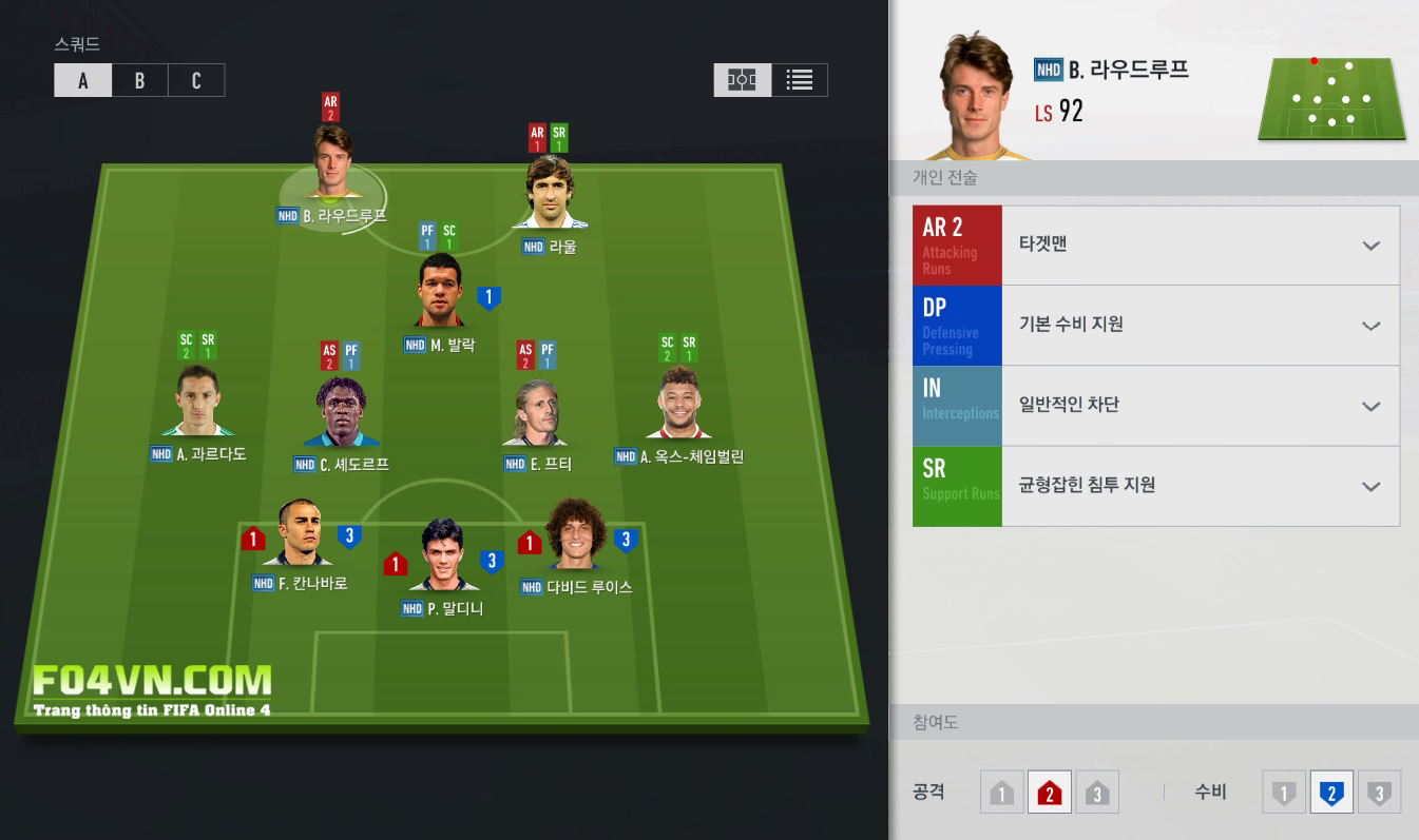 Hãy để 1 trong 2 vị trí tiền đạo cắm chơi vị trí trung tâm với AR2 trong khi tiền đạo còn lại để AR1,SR1 để cầu thủ của bạn có thể di chuyển một cách linh hoạt, khuấy đảo và thu hút phòng ngự đối phương tạo khoảng trống cho đồng đội di chuyển cũng như sẵn sàng đột phá bất ngờ khi cần thiết. Cùng xu hướng mặc định để tránh dâng cao và tạo nhiều liên kết với các vị trí tiền vệ hơn.