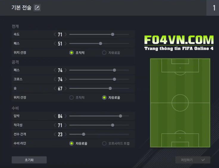 CF : AR1 xẻ nách, DP1 Pressing hàng phòng ngự đối phương, IN1 đánh chặn chủ động, SR1 chạy chỗ hỗ trợ đồng đội. Xu hướng chơi 3-1.