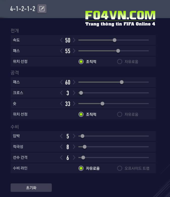 Sơ đồ chiến thuật được để mặc định như sơ đồ 4-1-2-1-2 gốc với 2 tiền đạo RS,LS. Tuyến tiền vệ gồm CAM,RCM,LCM và CDM.