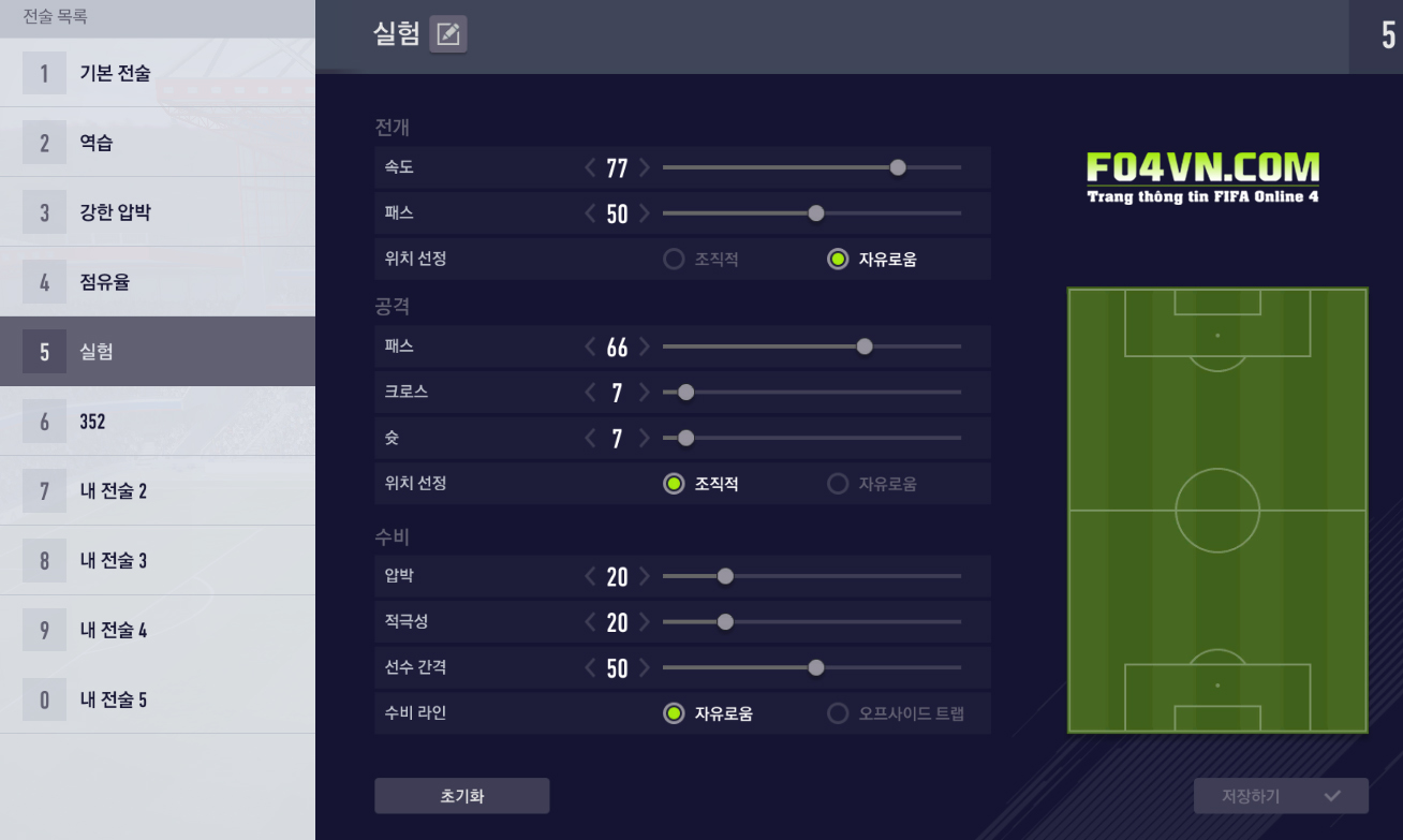 Tổng quát: hãy để lối chơi tự do để các cầu thủ di chuyển đa dạng hơn, hỗ trợ vị trí cho nhau tốt hơn trong việc kiểm soát thế trận. Cùng với tốc độ 77 sẽ giúp các đợt phản công cũng như tấn công chở nên vô cùng chớp nhoáng và khó lường. Chuyền 50 sẽ làm mật độ di chuyển của cầu thủ không quá xa và có phần mau lẹ hơn.
