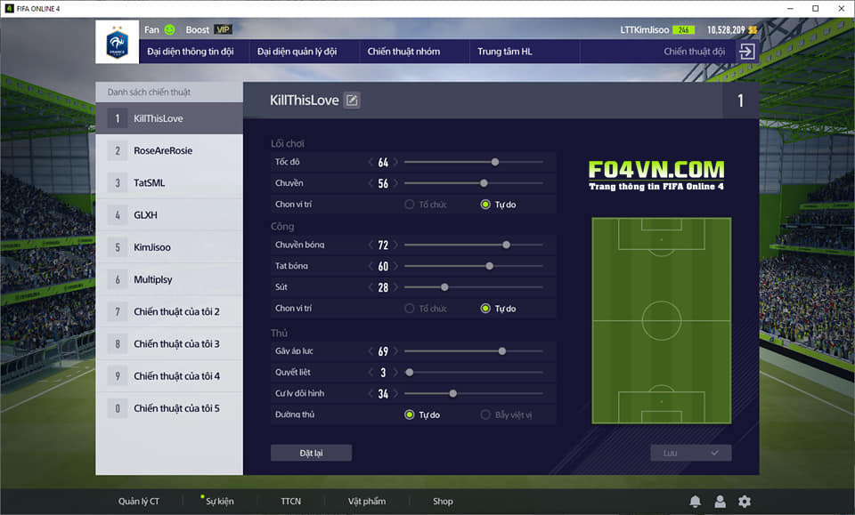 Thiết lập tấn công và tốc độ chơi ở mức trung bình và lối chơi chính tự do sẽ tạo nên sự đa dạng trong việc vận hành lối chơi phối hợp rồi nhồi bóng ra cánh một cách hiệu quả.