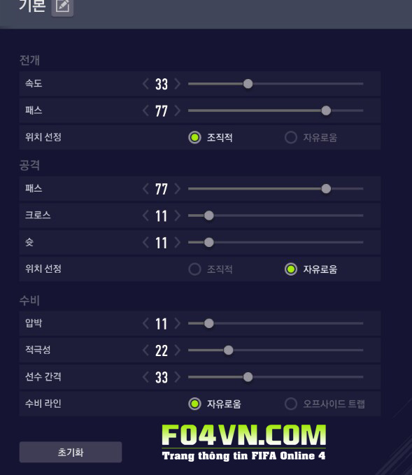 Mức chuyền cao trong tấn công giúp các vị trí chủ động dâng cao trong các tình huống triển khai bên phần sân đối thủ. Tạt và sút thiết lập thấp nhằm kéo các vị trí trên hàng công bó vào vòng cấm để nhận bóng và dứt điểm. Tấn công tự do nhằm giúp người chơi tự do ứng biến và sáng tạo trước hàng phòng ngự đối thủ.
