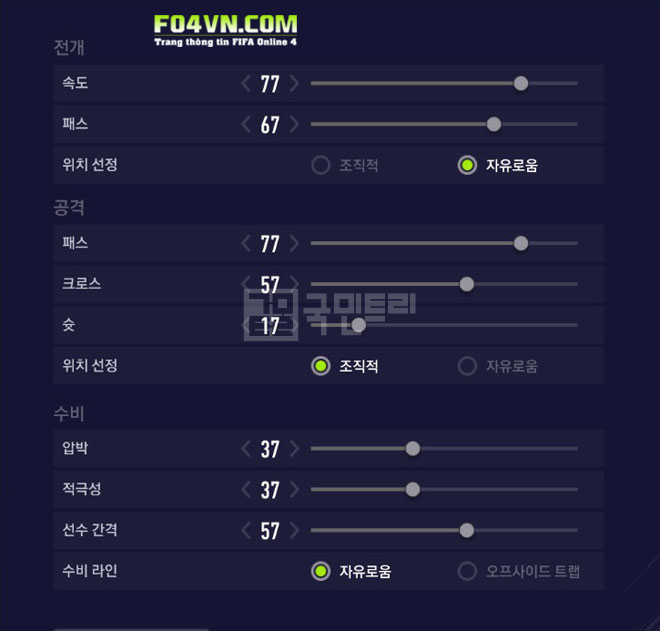 Nên để các vị trí cả về hàng tiền vệ lẫn tiền đạo ở xu hướng công thủ mặc định. Nhằm tối ưu hoá sự đa dạng trong cách di chuyển, hạn chế tạo quá nhiều khoảng không trong các đường tấn công lẫn phòng ngự. Lí do là đôi lúc nếu tiền đạo để công 3 hoặc tiền vệ phòng ngự để thủ 3, mức độ kéo giãn đội hình sẽ là rất lớn dẫn đến tạo ra một khoảng trống mênh mông tuyến giữa cho đối thủ triển khai bóng. Đó sẽ là điều vô cùng nguy hiểm.