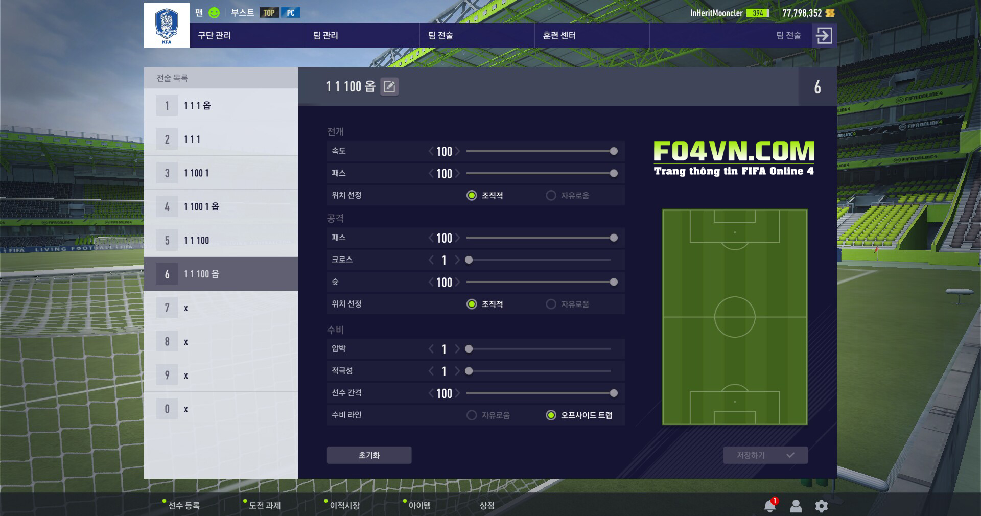 Chiến thuật tổng quát được thiết lập tương tự hình bên dưới với tốc độ chơi và chuyển bóng ở mức cao. Sút bóng cũng như chuyền bóng đều được thiết lập ở mức 100. Với thiết lập này, lối chơi tự động sẽ ở mức tấn công gây áp lực lớn và lối chơi nhanh, tốc độ cao