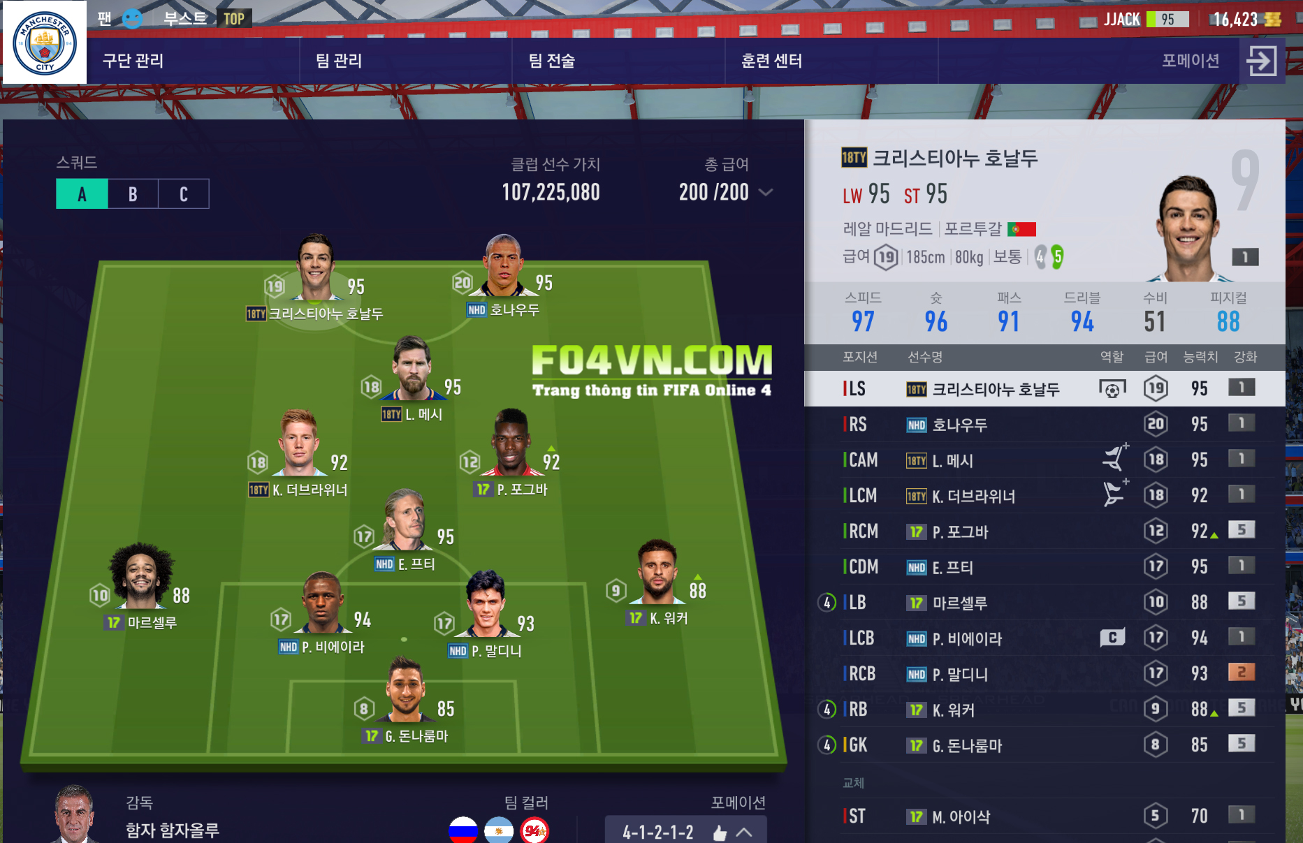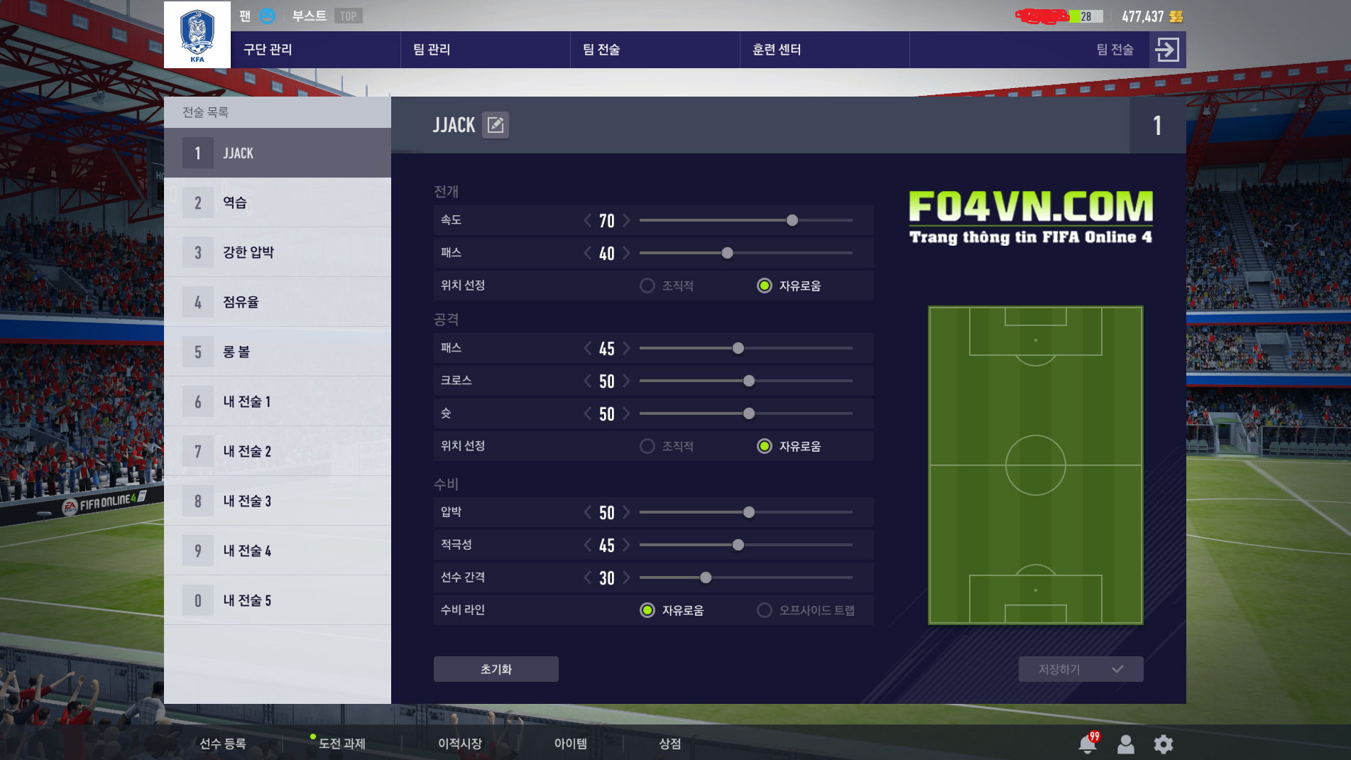 Tổng quát: để tốc độ 70 để lối chơi trở nên nhanh nhẹn, linh hoạt, và tốc độ phản công trở nên nhanh hơn. Mức chuyền 40 để giúp các vị trí tiền vệ cũng như tiền đạo di chuyển sát nhau, tránh trường hợp kéo quá giãn đội hình và triển khai lối chơi rời rạc. Lối chơi "tự do" để di chuyển tấn công đa dạng khó lường.