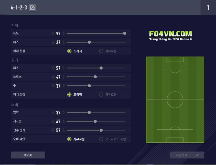 Phòng ngự: Gây áp lực 37 và quyết đoán 47 sẽ giúp hạn chế dâng cao của các vị trí. Cùng với biên độ 57 để tránh việc đứng quá có cụm của các cầu thủ và để hổng 2 cánh cho đối phương triển khai tấn công. Phòng ngự tự do sẽ giúp các vị trí hỗ trợ nhau tốt hơn.