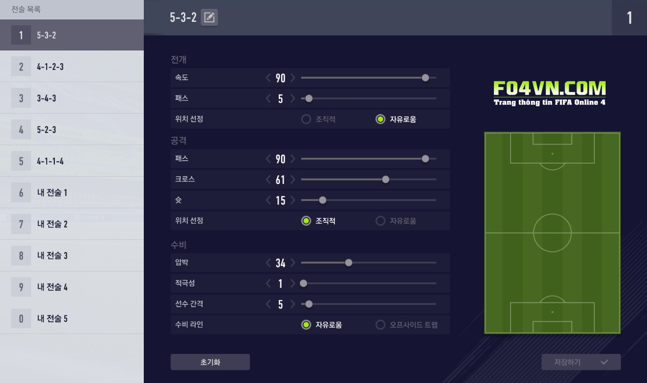 Phòng ngự : Gây áp lực 34 hạn chế tối đa mức độ gây áp lực, kéo thấp các vị trí thi đấu trên sân khi phòng ngự, cùng quyết đoán 1 sẽ hỗ trợ các cầu thủ phòng ngự chỉ áp sát và vào bóng khi thực sự có cơ hội. Biên độ 5, cực thấp giúp kép hẹp cự li phòng ngự cùng với phòng ngự tự do sẽ giúp các vị trí hỗ trợ nhau phòng ngự tốt hơn.