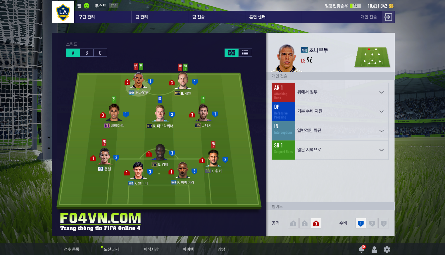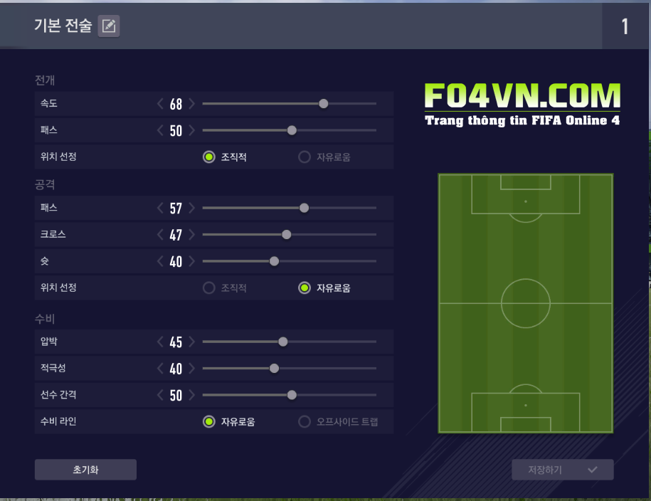 Phòng thủ : Gây áp lực 45 và quyết đoán 40 sẽ giúp các cầu thủ phòng ngự vào bóng bình tĩnh để kéo dài thêm thời gian cho các vị trí khác lui về hỗ trợ phòng ngự.Biên độ 50 giúp kéo dãn đội hình phòng ngự, bảo vệ tốt hơn phạm vi phòng thủ trước gôn. Lối phòng ngự tự do sẽ giúp các vị trí bọc lót cho nhau tốt hơn.
