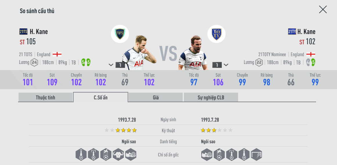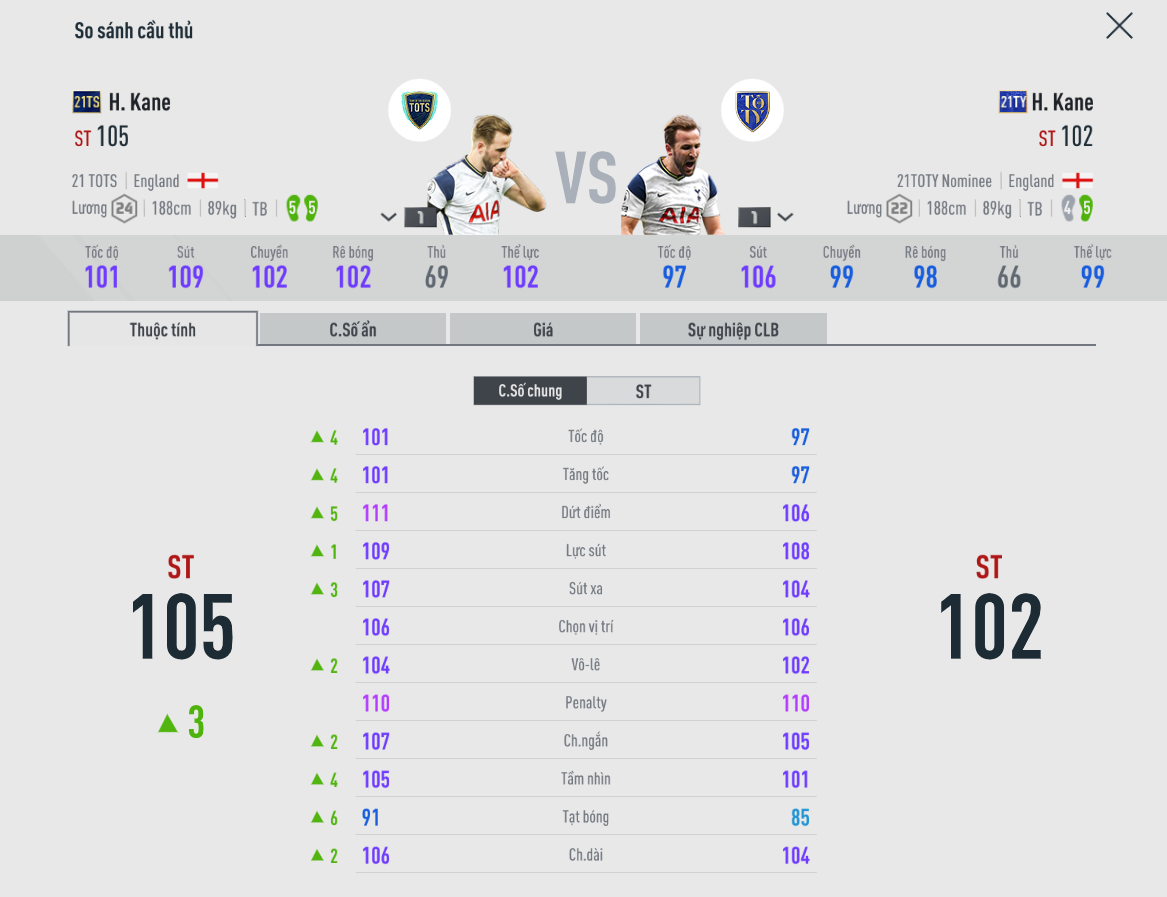Kane 21TS chắc chắn là nhanh hơn hẳn, chỉ cần nhìn vào chỉ số chắc nhiều bạn cũng đoán ra. Đây là một điểm cộng khá lớn cho những bạn vẫn than phiền về tốc độ của tiền đạo người Anh. Bởi so với các hậu vệ bây giờ thì Kane 21TY có phần hơi đuối khi tăng tốc