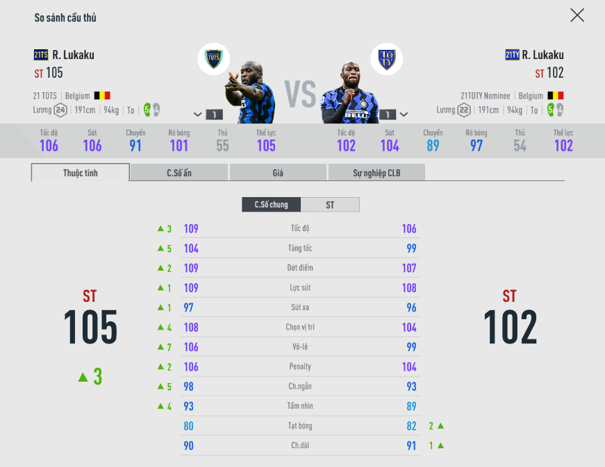 21TS và 21TY không cho thấy sự khác biệt lắm, có lẽ bởi vì Lukaku đã khỏe sẵn rồi và chả ngán hậu vệ nào. Chính điều này làm cho chỉ số sức mạnh và quyết đoán của 21TS tuy cao hơn nhưng không cảm thấy nó thực sự cần thiết. Tỷ lệ 1vs1 vẫn rất cao.