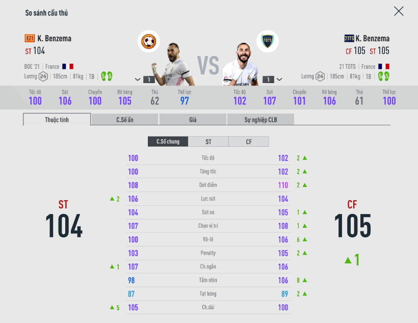 Mùa giải 21TS hơn điểm chỉ số thành phần và có lẽ nó chỉ thực sự có tác dụng khi bạn gắn cho Benzema kỹ năng nhạy bén. Còn về cơ bản không khác biệt nhiều.