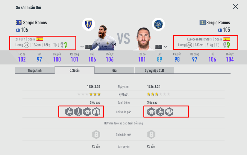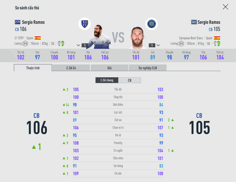 Đây là điều quan trọng nhất khi bạn phân vân giữa hai mùa giải. Xét chi tiết cụ thể thì Ramos EBS tackle bóng, và cản phá tốt hơn. Tuy nhiên khả năng đánh chặn tầm xa lại có phần kém so với 21TY. Khả năng không chiến cũng không được tốt bằng . Tuy vậy có một điểm mà bạn cần lưu ý đó chính là chân trái của 21TY là 4 sao, trong khi đó của EBS chỉ là 3. Điều này sẽ ảnh hưởng đến khá nhiều trong các pha truy cản của Ramos. Bởi tỷ lệ chân chiêu thành công sẽ tốt hơn.